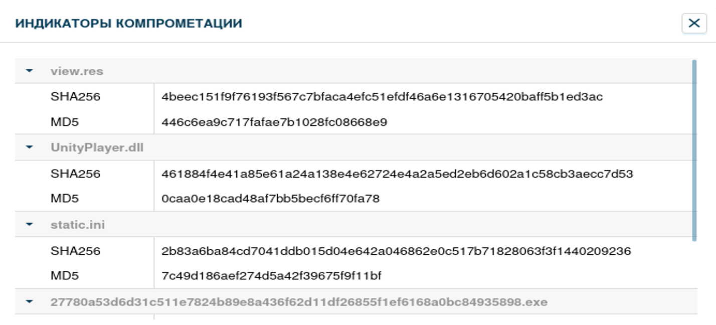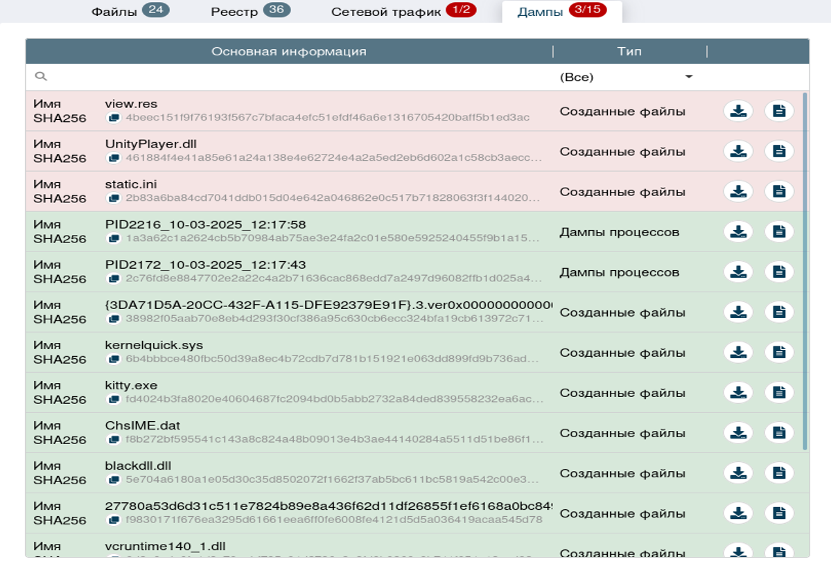 В блоке «Дампы» видно, что ПО во время работы создало файлы с расширениями res, dll и ini. Злоумышленники могут использовать файлы с этими расширениями для распространения вредоносных программ путем изменения содержимого файла.