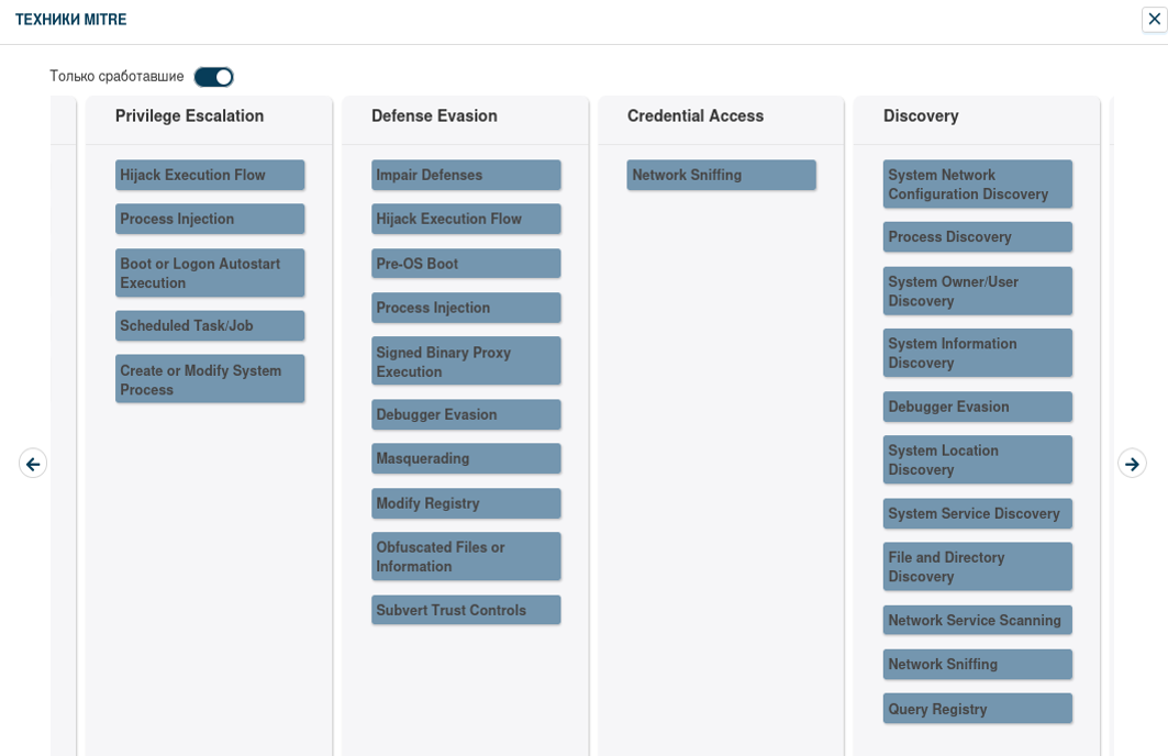 Во вкладке “Техники MITRE” видно, что отработало несколько техник: