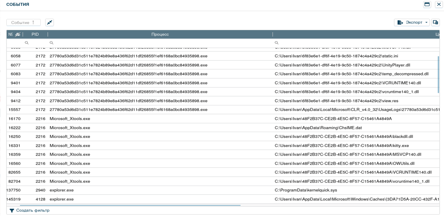 В блоке «События» можно заметить записи “Создание файлов”. Вирус создает драйвер «kernelquick.sys» в ОС при помощи исполняемого файла explorer.exe