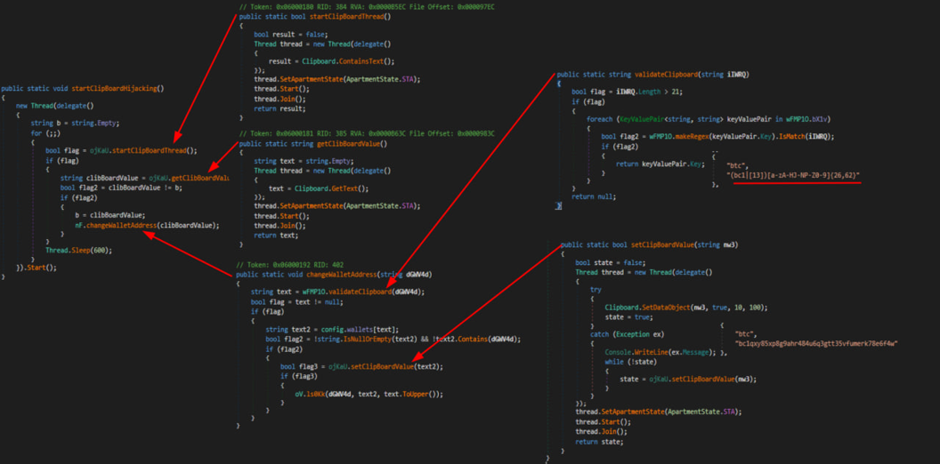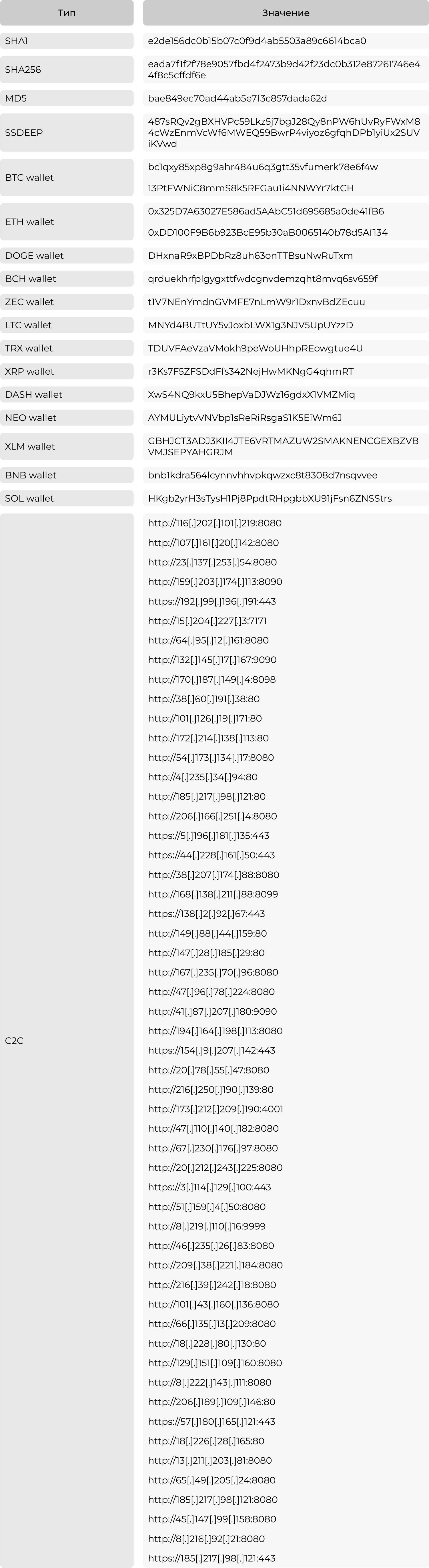 В конфигурации ВПО прописываются адреса криптокошельков для различных монет: Monero, Bitcoin, Bitcoin Cash, Zcash, Ethereum, Doge, Litecoin, Tron, Ripple, Dash, Neo, Stellar Lumens, Binance, Solana, Algory Project, которые будут подменяться в буфере обмена у жертвы.