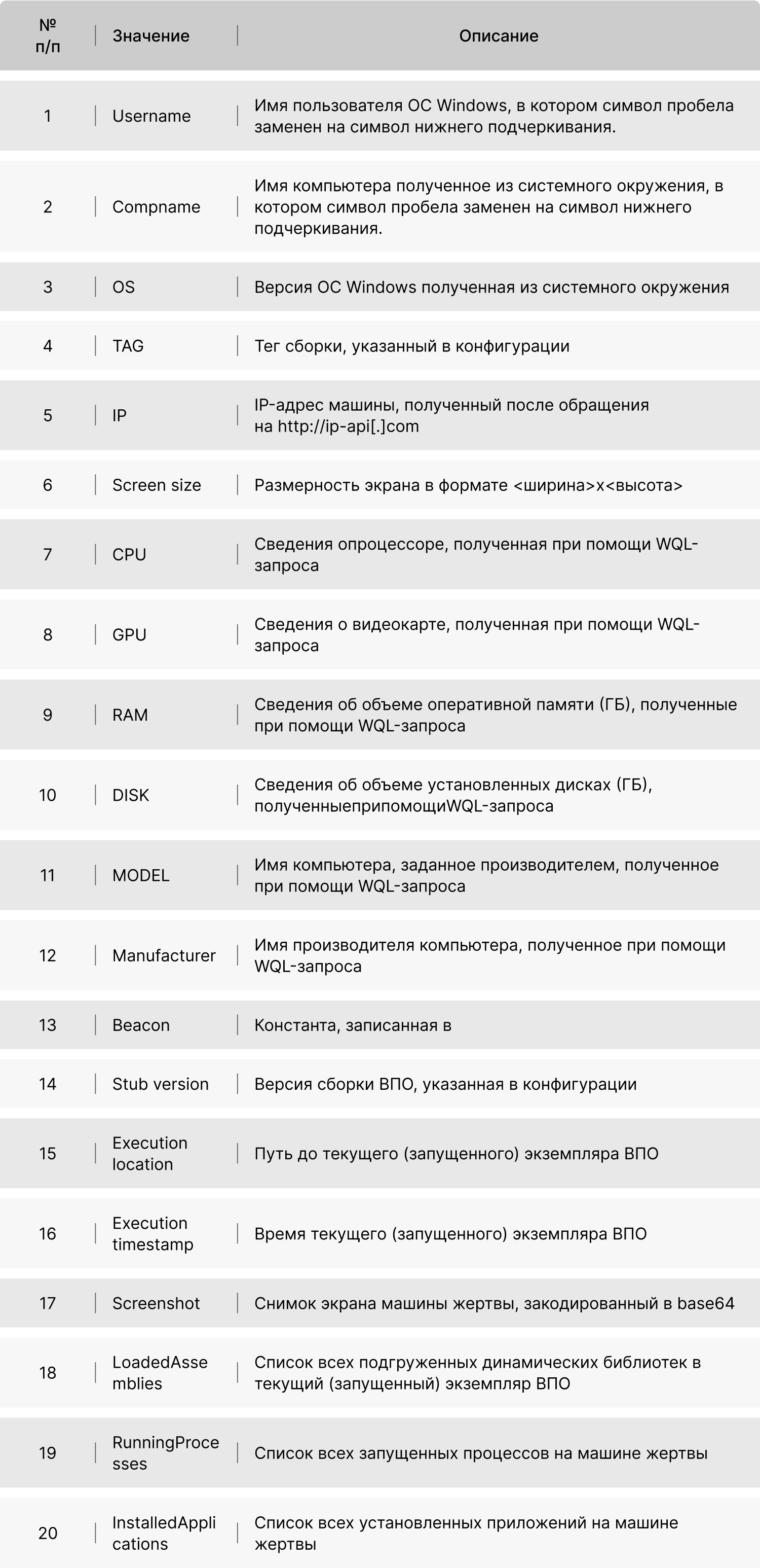 Полученная команда «REFRESH» отправляет на сервер злоумышленника повторно собранные данные о машине жертвы, представленные в таблице 2.