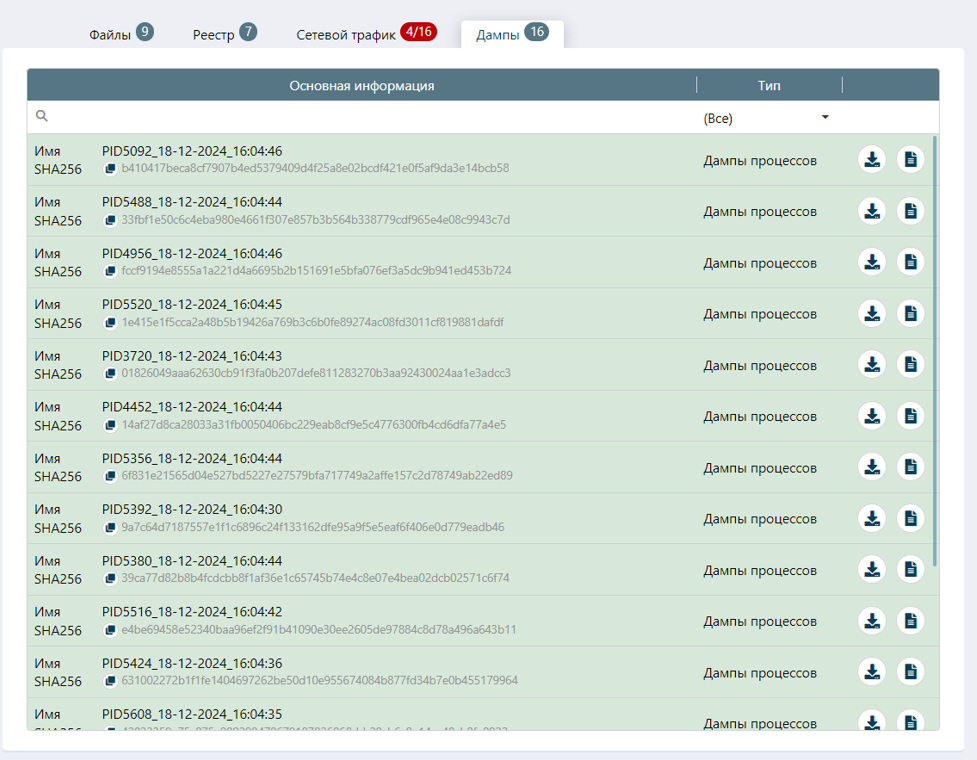 Все собранные дампы (процесса и созданных файлов) отображаются в блоке «Дампы». Каждый дамп проверяется в статическом исследовании.
