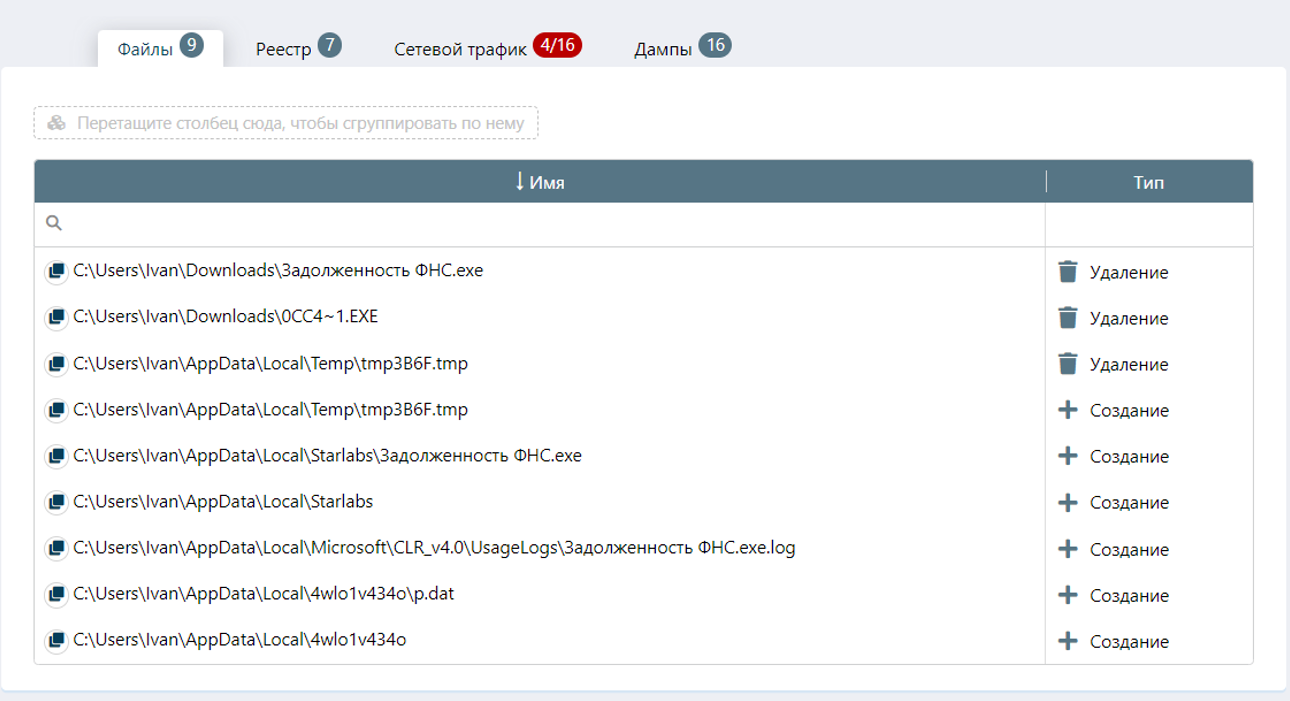 В ходе исследования ВПО создавало файлы и перемещалось, на скриншоте видно, что был удален запущенный экземпляр и создан в директории