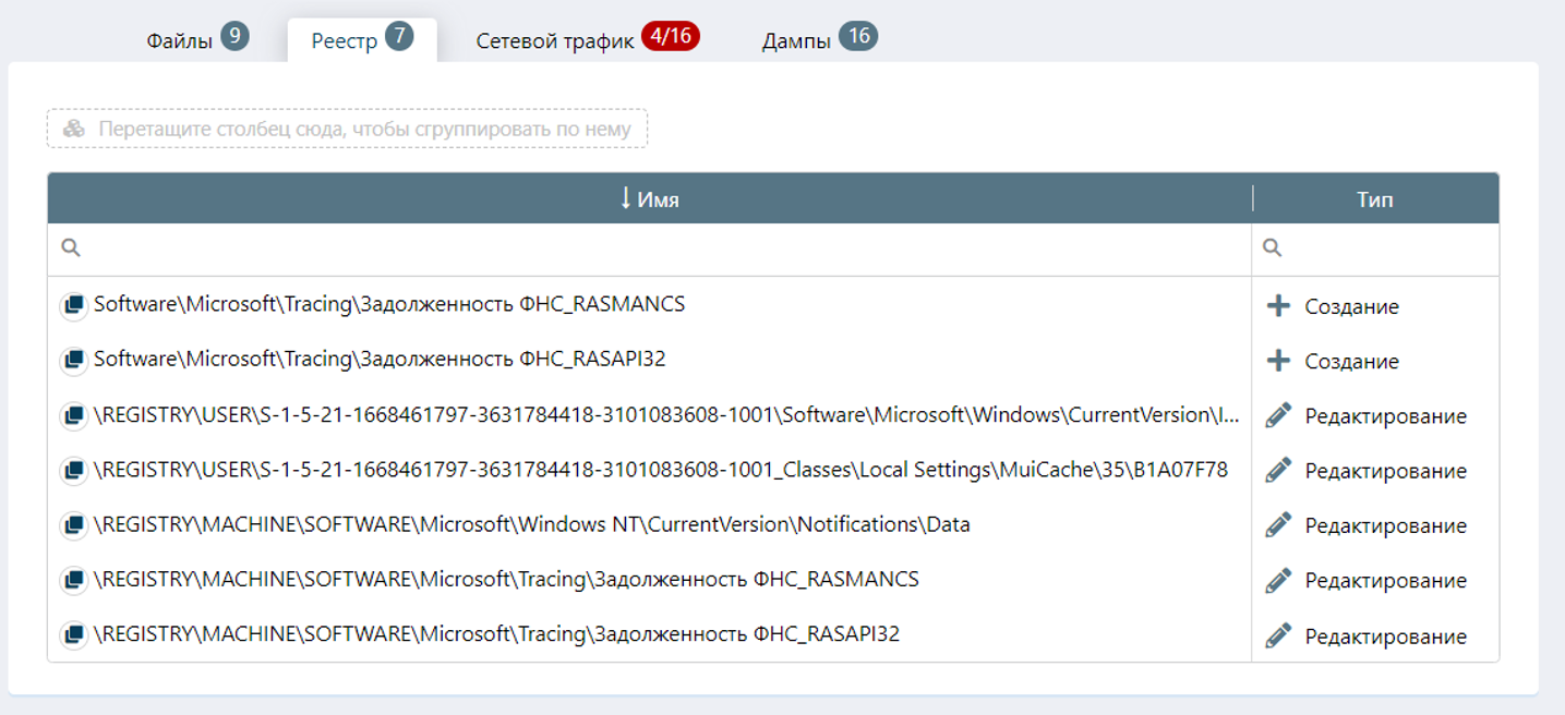 В реестре внесены изменения, из интересного в реестр \REGISTRY\MACHINE\SOFTWARE\Microsoft\Tracing\ внесены изменения, перенаправляющие вывод из консоли ВПО в созданный файл логирования: