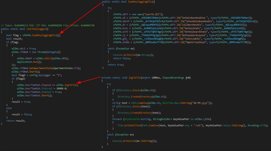 В ВПО реализован кейлоггер, который подгружает динамические библиотеки при помощи вызова отдельного метода, вместе со созданием потока с обработчиком событий. Собранные сведения с клавиатуры жертвы пишутся в создаваемую директорию в формате dd-mm-yyyy.