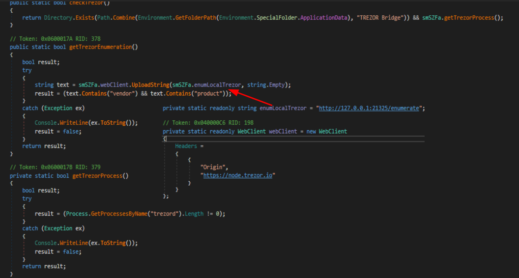 Проверяется наличие процесса trezor на машине жертвы, в том числе, создается web-запрос 127.0.0.1:21325/enumerate, а также проверяется путь в системной директории %AppData%\TREZOR Bridge\