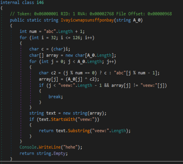 Сама функция, представляет собой гаммирование при помощи XOR c перебором всех печатаемых ASCII-символов (по таблице от 32 до 126), таким образом, чтобы результат операции XOR над входной строкой начинался с префикса «veew:». Если по результатам операции формируется соответствующий префикс, то он отбрасывается.