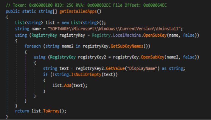 В том числе, ВПО собирает информацию об установленных приложениях на машине жертвы, при помощи обращения в реестр