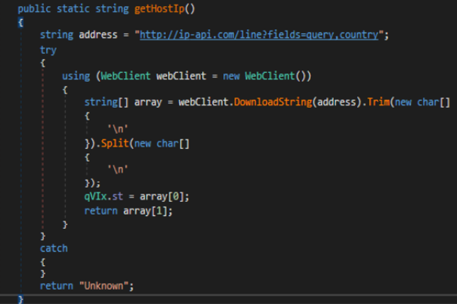 ВПО собирает информацию о машине жертвы, в том числе IP-адрес машины жертвы, и страны нахождения при помощи http-запроса на ресурс http://ip-api[.]com/line?fields=query,counrty .