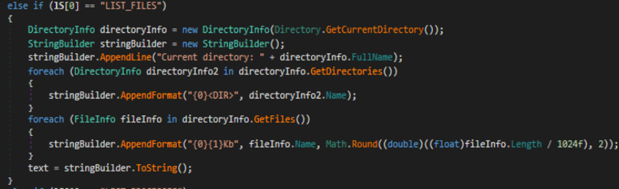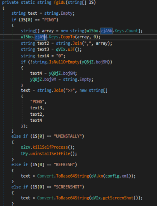 Поскольку это вирус удаленного доступа, в нем реализована работа с терминалом злоумышленника, который при помощи словаря проверяет полученные команды: