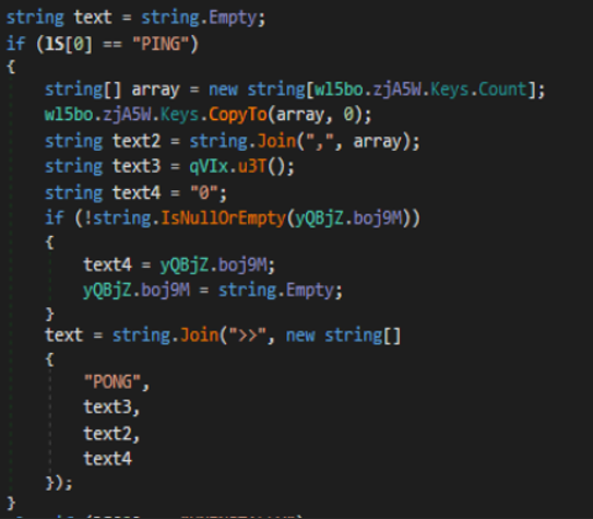 При получении команды «PING» с управляющего сервера формируется строка с ответом «PONG» и массива с именем запущенного экземпляра ВПО и данных собранных кейлоггером