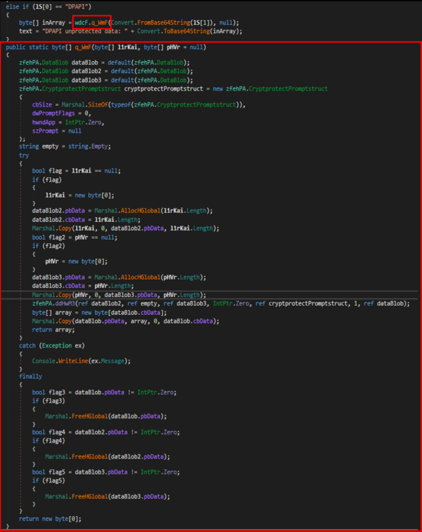 При получении команды «DPAPI» вызывает метод для дешифрования при помощи Widnows Data Protection API – CryptoProtectData. В качестве аргумента команды передаются данные, требующие дешифрования с машины жертвы.