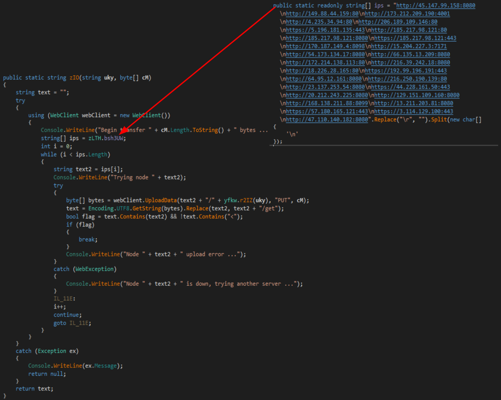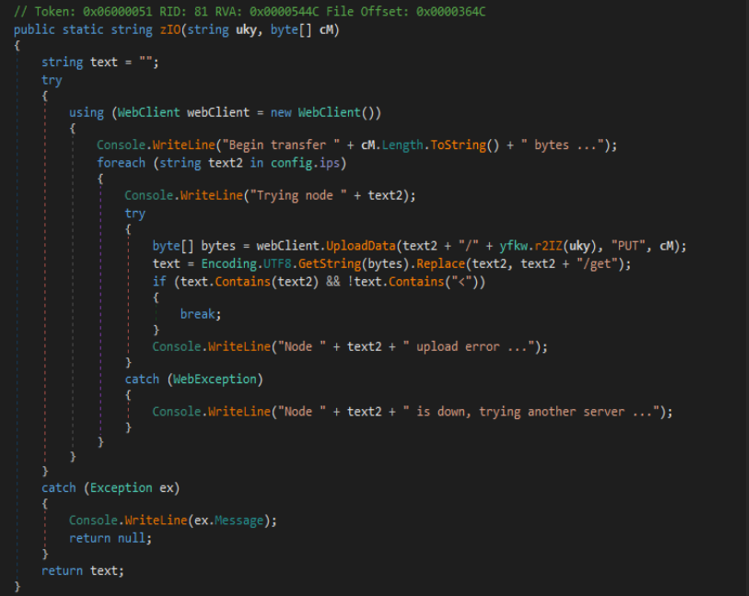 При получении команды «TRANSFER» выполняется отправка файла с машины жертвы С2С сервера злоумышленника при помощи протокола HTTP с методом «PUT». В качестве адресата перебирается массив серверов, указанных в конфигурации ВПО, если узел недоступен берется следующий адрес.