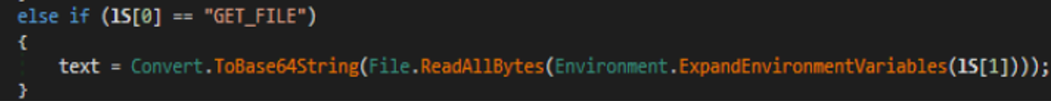 При получении команды «GET_FILE» возвращается закодированная base64 строка, содержащая в себе байты запрашиваемого в качестве аргумента файла: