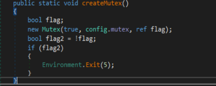 Далее, выполняются инструкции проверки мьютекса, чтобы предотвратить одновременное исполнение двух экземпляров ВПО. Значение мьютекса берется из конфигурации: