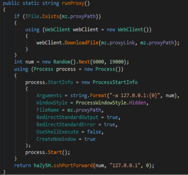 При получении команды «EXPOSE» запускается прокси-сервер на машине жертвы. На выбор возможна реализации посредством протокола SSH и протокола Serveo либо TOR, в зависимости от того, что было указано в конфигурации.