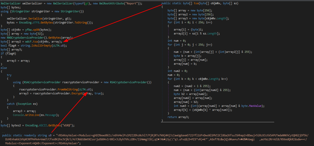 Собранные данные жертвы собираются в файл с расширением WSR. Сериализуются в XML-формате, после чего выполняются инструкции по их шифрованию и сжатию при помощи алгоритма RS4 со случайным ключом, при этом, если в конфигурации указано, что шифрование происходит при помощи RS4 и RSA, ключ от RS4 шифруется через RSA и сохраняется в конфигурации