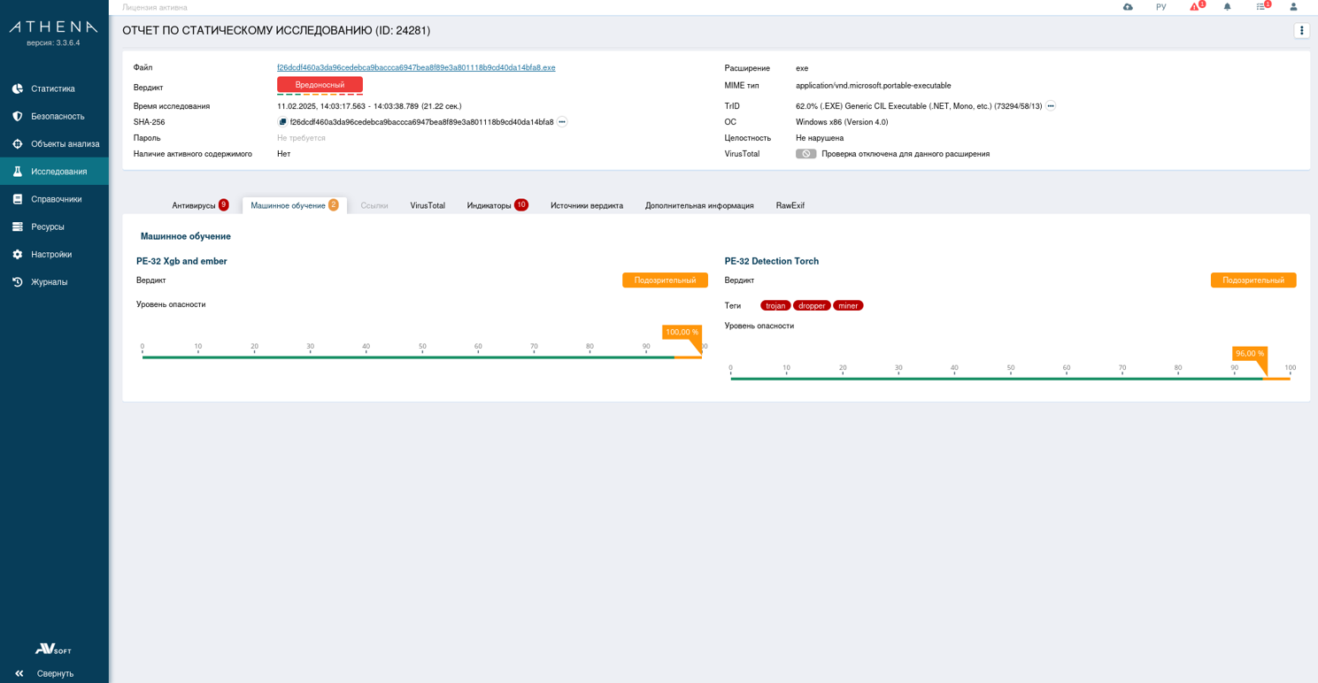 Исследования файла происходило с помощью системы ATHENA. Для начала посмотрим на статический и динамический анализ файл в системе ATHENA.