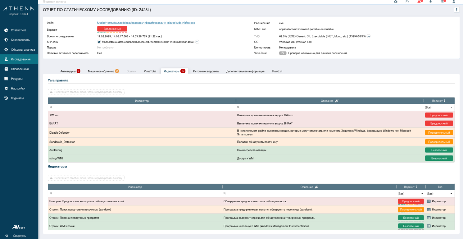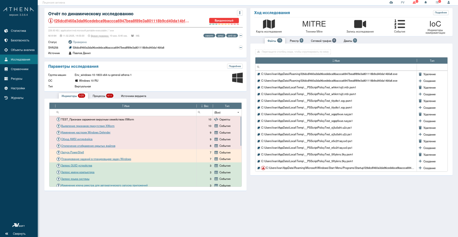 Динамический анализ в системе AVSOFT ATHENA выявил множество вредоносных индикаторов. Среди них отмечаются: