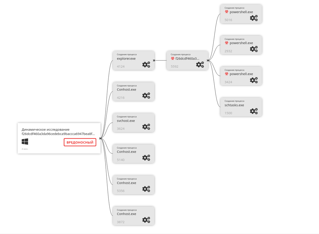 Среди системных программ, выявленных в процессе динамического исследования, были выявлены такие как: powershell.exe, schtasks.exe, Conhost.exe и svchost.exe.